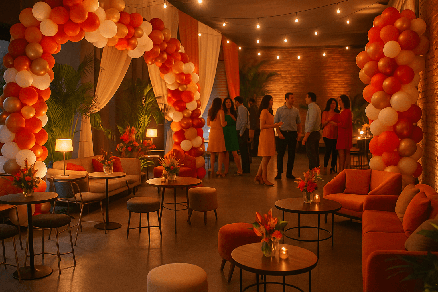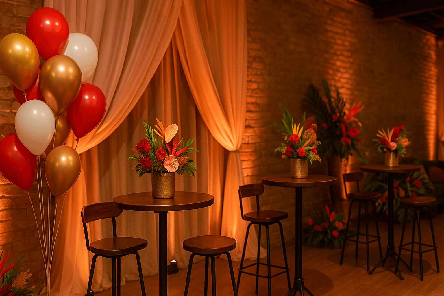Mesas bistrô com banquetas altas criam pontos de encontro perfeitos para circular, conversar e brindar, enquanto balões orgânicos em tons de vermelho, branco, dourado e nuances como rosé gold ou terracota reforçam a identidade visual da Lello. Tecidos fluidos suavizam o ambiente, combinados a uma iluminação quente que traz charme e movimento, e arranjos florais contemporâneos – com folhagens e flores tropicais – adicionam um toque vibrante e acolhedor ao espaço.