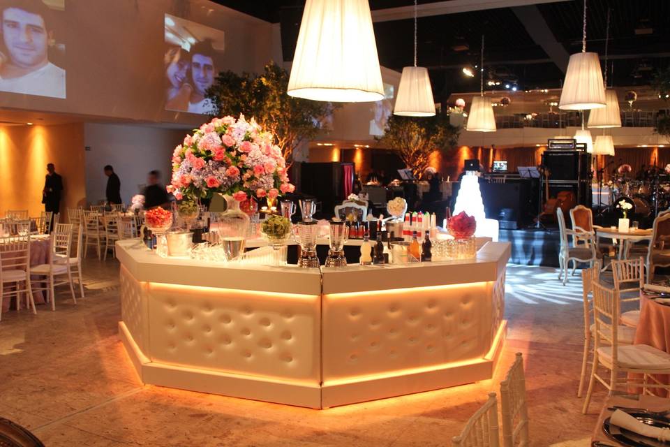 Para fotos e compartilhamentos, um espaço instagramável personalizado com o logo da Lello e a frase “Conectados pelo que construímos juntos” destaca-se como cenário exclusivo. A decoração valoriza o estilo rústico-contemporâneo do local, distribuindo as áreas de forma funcional: lounges de descanso ao lado da pista de dança, bistrôs próximos ao bar e pontos de destaque para sobremesas, garantindo fluidez e uma experiência memorável em cada detalhe.